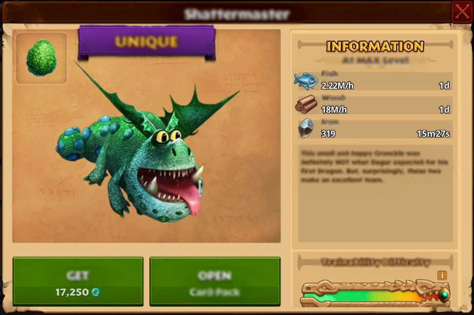 Tapping on any dragon card in the menu will present you with information about the dragon like resource gathering stats (at MAX level), description, and their trainability difficulty. In this same window, you will also have the option to buy certain dragons with Runes as well as be redirected to anywhere else you can obtain them (Search, Journey, Season Hub, etc).
