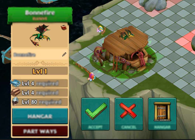 Place: If you choose to place the dragon, you will be able to place the roost anywhere on your Berk where there is enough space for the roost. A grid will be shown to facilitate this for you, with the roost displaying in green if it can be placed or red if there is not enough space. You will also have the cancel and Hangar options available, both of which store the dragon in your Hangar.