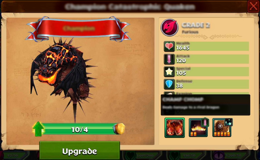Upgrade will show you the same window but allow you to upgrade you dragon. In order to upgrade your dragon, you need to have enough Tokens, which is indicated by the number and progress bar on their card. You may also need to train your dragon to a specific level on Berk to continue upgrading them in Brawl. If you have enough tokens and your dragon is at the required level on Berk, you can tap on Upgrade below the progress bar to upgrade the dragon to the next Brawl grade, which will increase its stats.