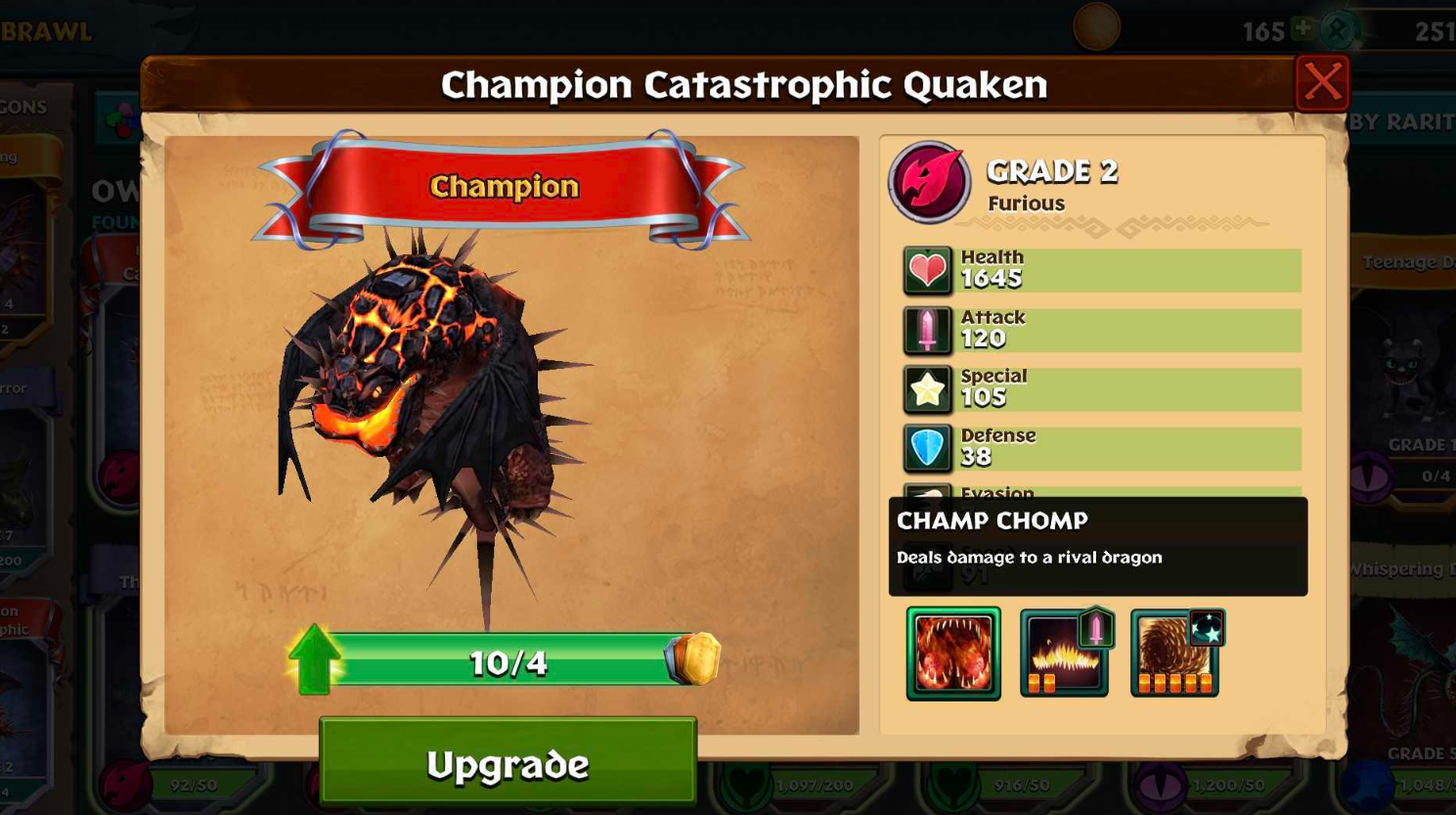 Upgrade will show you the same window but allow you to upgrade you dragon. In order to upgrade your dragon, you need to have enough Tokens, which is indicated by the number and progress bar on their card. You may also need to train your dragon to a specific level on Berk to continue upgrading them in Brawl. If you have enough tokens and your dragon is at the required level on Berk, you can tap on Upgrade below the progress bar to upgrade the dragon to the next Brawl grade, which will increase its stats.