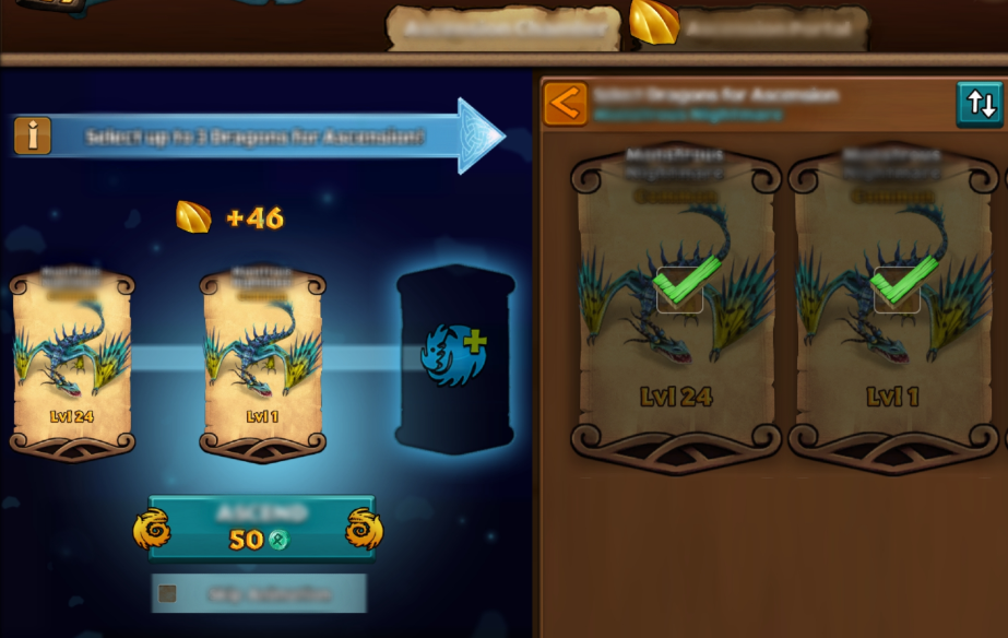 In the Ascension Chamber menu, you can select one or more of the same dragon (up to 3 dragons) to ascend. Ascension costs 50 Runes and the amount of Scales/Elusive Scales you obtain will depend on the rarity of the dragon, their level, and the amount that were ascended. Keep in mind that dragons that are currently busy cannot be ascended, they must be on their roost.