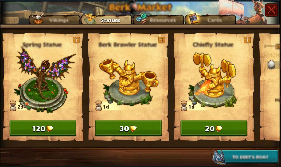 Statues are a special type of decoration that have special effects that change gameplay! Contrary to normal decorations, Statues provide special boosts to aid you throughout your adventures on Berk (such as boosting gathering rates, hatching dragons faster, and even preventing opponent evasion in Brawl matches). They can still be moved and placed anywhere there is free space on your Berk.