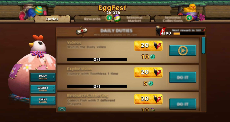 - 일일 임무는 더 작은 보상을 제공하지만 더 자주 완료할 수 있습니다. 매일 갱신됩니다.