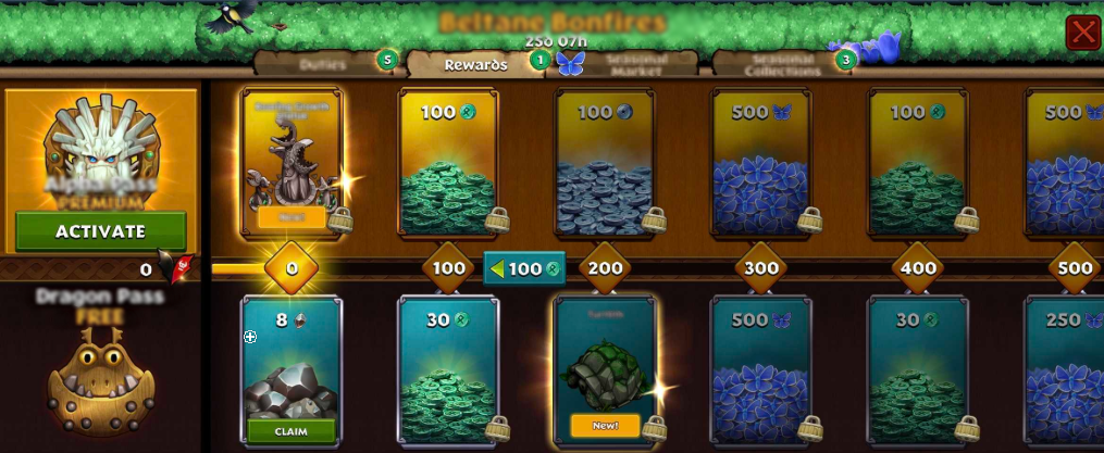 시즌 패스에는 무료 트랙과 프리미엄 트랙의 두 가지 트랙이 있습니다. 무료 트랙(일명 드래곤 패스)은 모든 플레이어가 무료로 이용할 수 있습니다. 프리미엄 트랙(일명 알파 패스)은 인앱 구매를 통해 활성화할 수 있습니다. 이 트랙은 더 크고 독점적인 보상을 제공합니다! 알파 패스를 활성화하려면 왼쪽에 있는 "활성화" 버튼을 탭해야 합니다. 알파 패스를 구매할 수 있는 옵션이 표시됩니다.